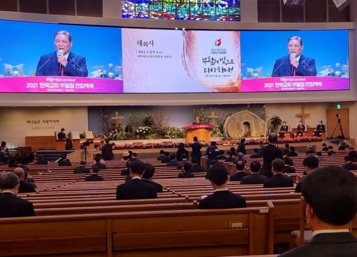 2021한국교회부활절연합예배가 4일 오후 4시 서울 서초구 사랑의교회(담임목사 오정현)에서 보수와 진보 교단장과 연합기관장, 목회자와 성도 700여 명이 참석한 가운데 열렸다.